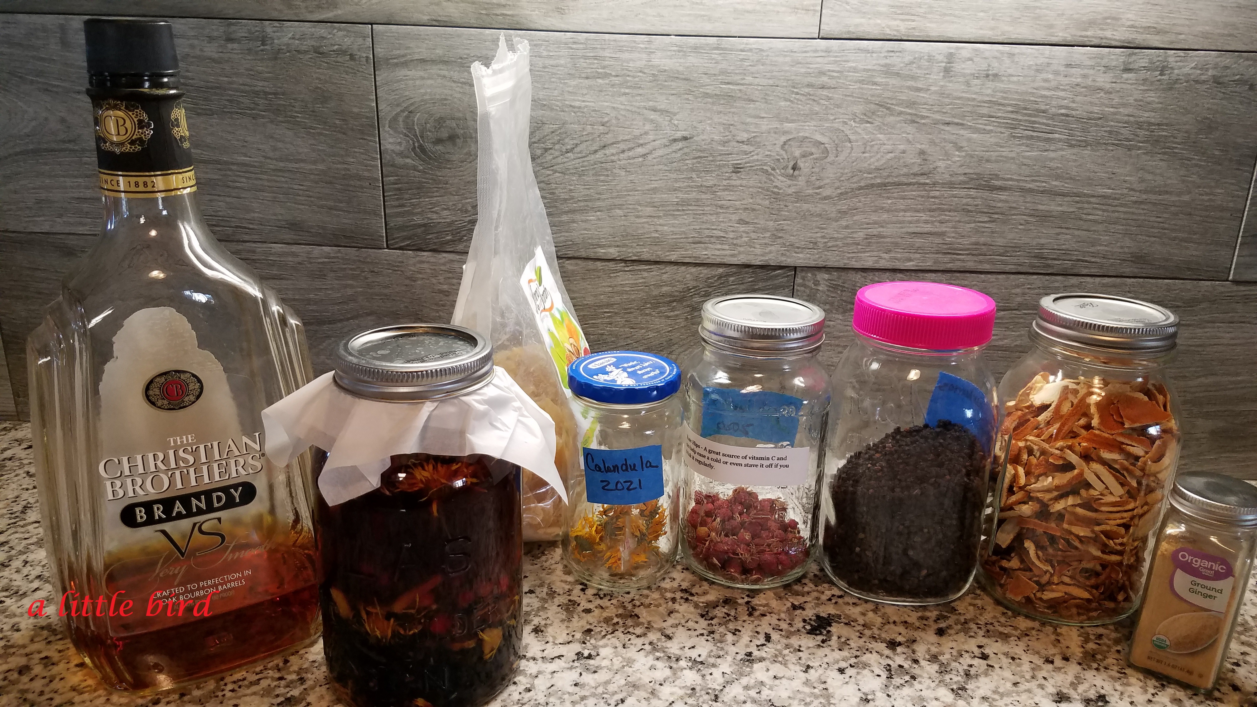 Add brandy, pouring until herbs covered by 1-2 inches of brandy and jar is approximately 3/4 full.